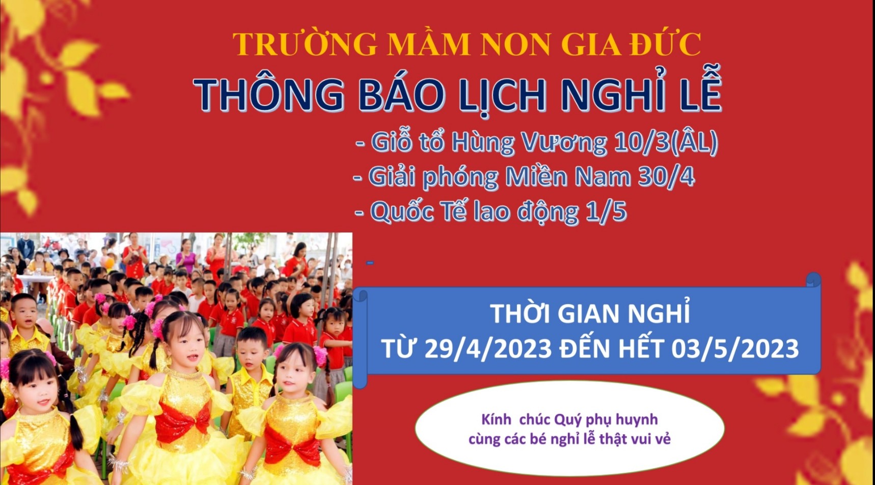 Trường mầm non Gia Đức trân trọng thông báo đến Quý phụ huynh và các đồng chí CB - GV - NV lịch nghỉ lễ giỗ Tổ Hùng Vương 10/03 (Âm lịch), ngày Giải phóng miền Nam thống nhất đất nước 30/04, ngày Quốc tế lao động 01/05. Cán bộ, giáo viên, nhân viên và học sinh được nghỉ 5 ngày từ ngày 29/04/2023 đến hết ngày 03/05/2023 tổ chức dạy học bình thường từ thứ 5 ngày 04/05/2023.